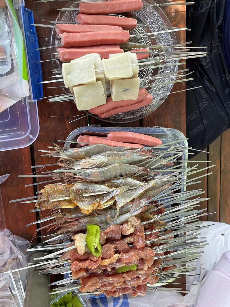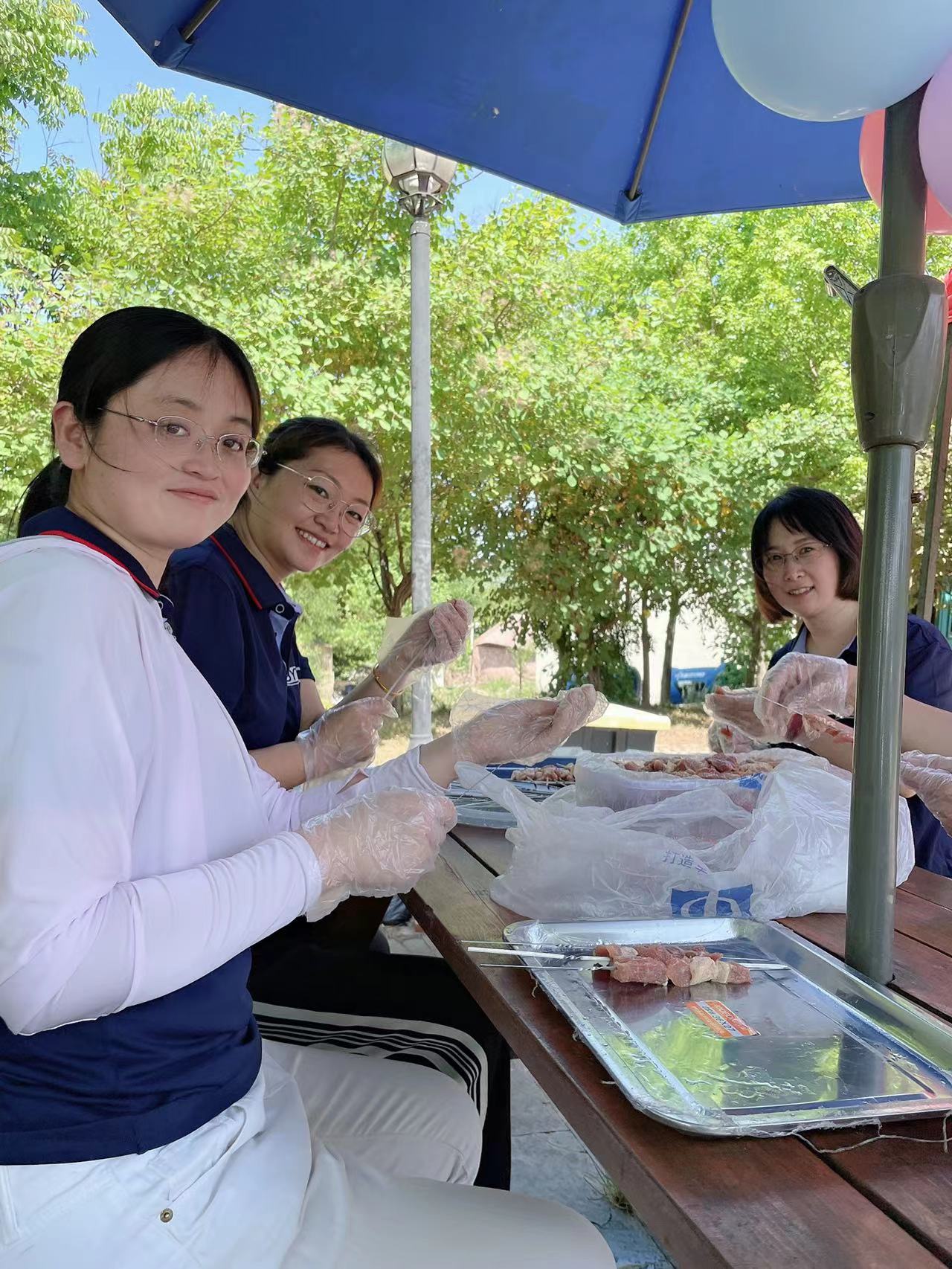 女生們也都沒閑著,積極的為燒烤師傅們進(jìn)行食材的清洗和串串的工作。
