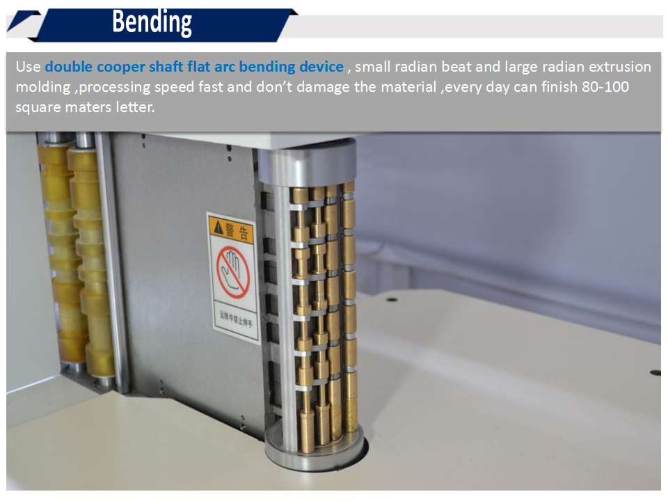 6.采用雙排銅軸設(shè)計(jì),純平式彎弧器,小弧度拍、大弧度擠壓成型,做字速度快,而且不傷料,每天可做80-100平方字。