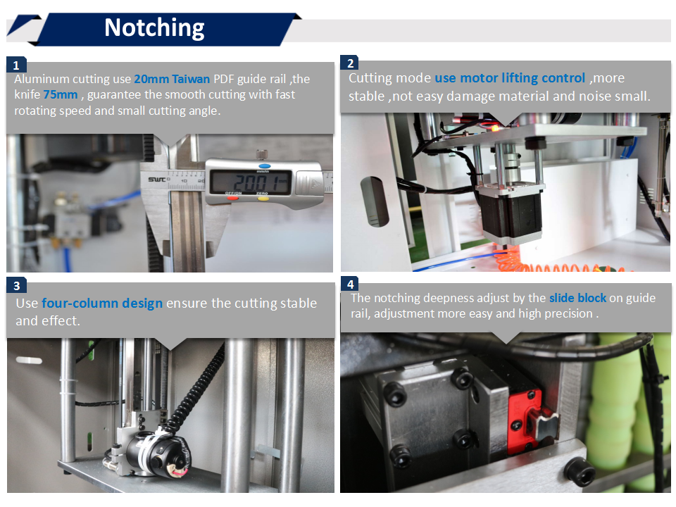 2. 鋁材切割部分使用的20mm臺(tái)灣PDF導(dǎo)軌,直徑75mm切割刀頭,既保證了轉(zhuǎn)速快切割更平穩(wěn),又保證能切割出小角度。