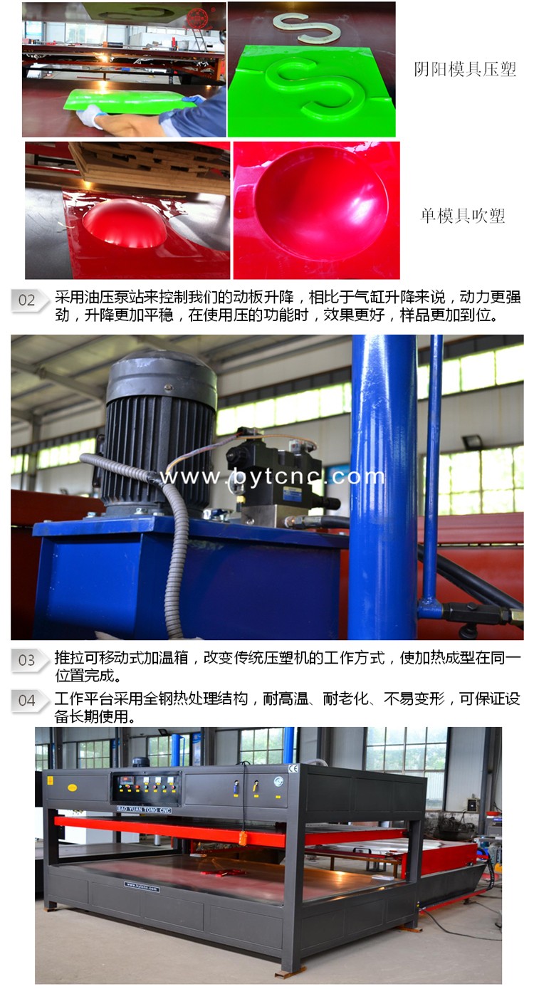 3.推拉可移動(dòng)式加溫箱,改變傳統(tǒng)壓塑機(jī)的工作方式,使加熱成型在同一位置完成。
