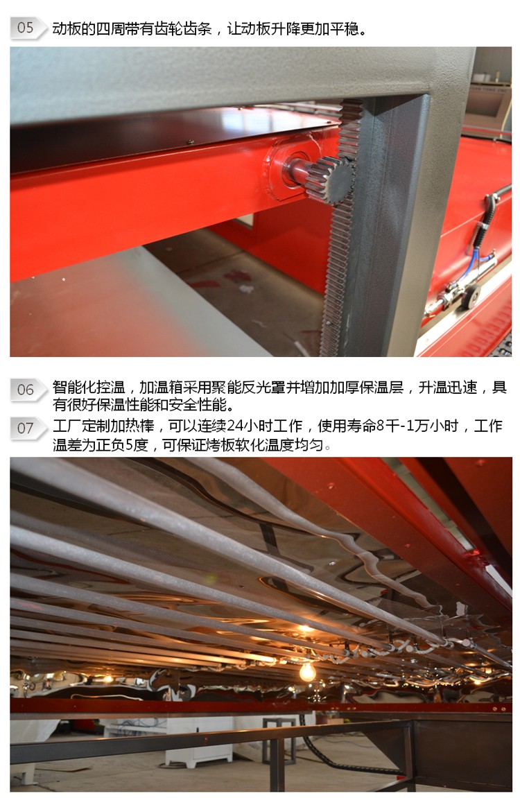 7.工廠定制加熱棒,可以連續(xù)24小時(shí)工作,使用壽命8千-1萬小時(shí),工作溫差為正負(fù)5度,可保證烤板軟化溫度均勻。